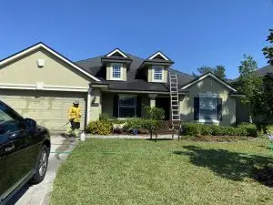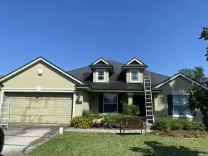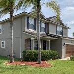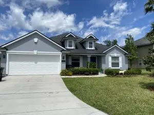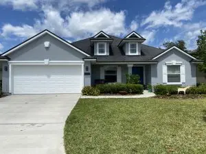 This World Golf Village home received a dramatic color change, turning an outdated, faded green into a modern gray-blue accented with crisp white trim and soffits.
