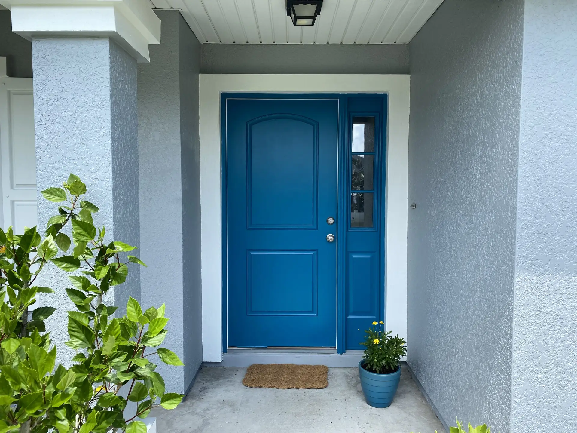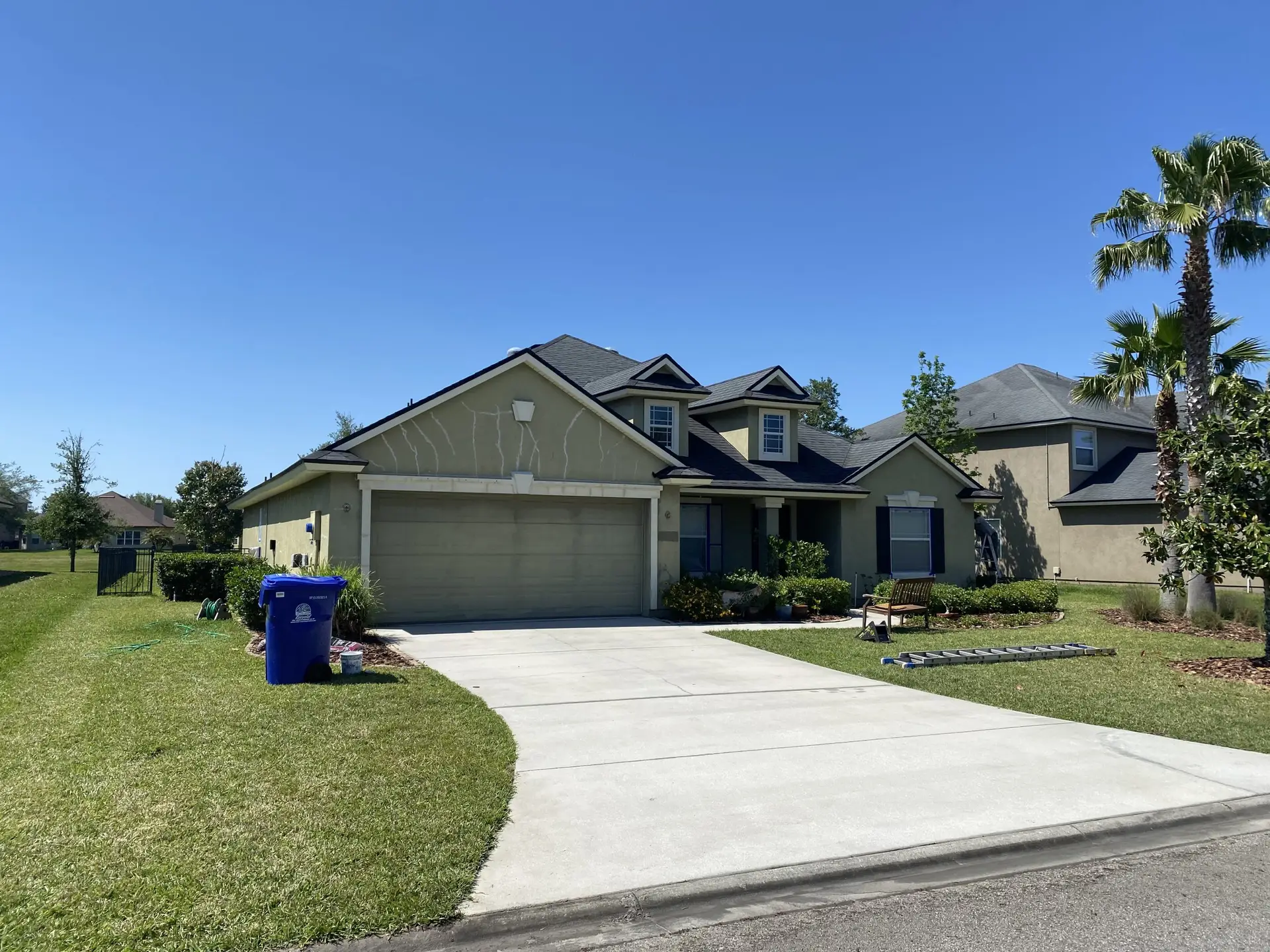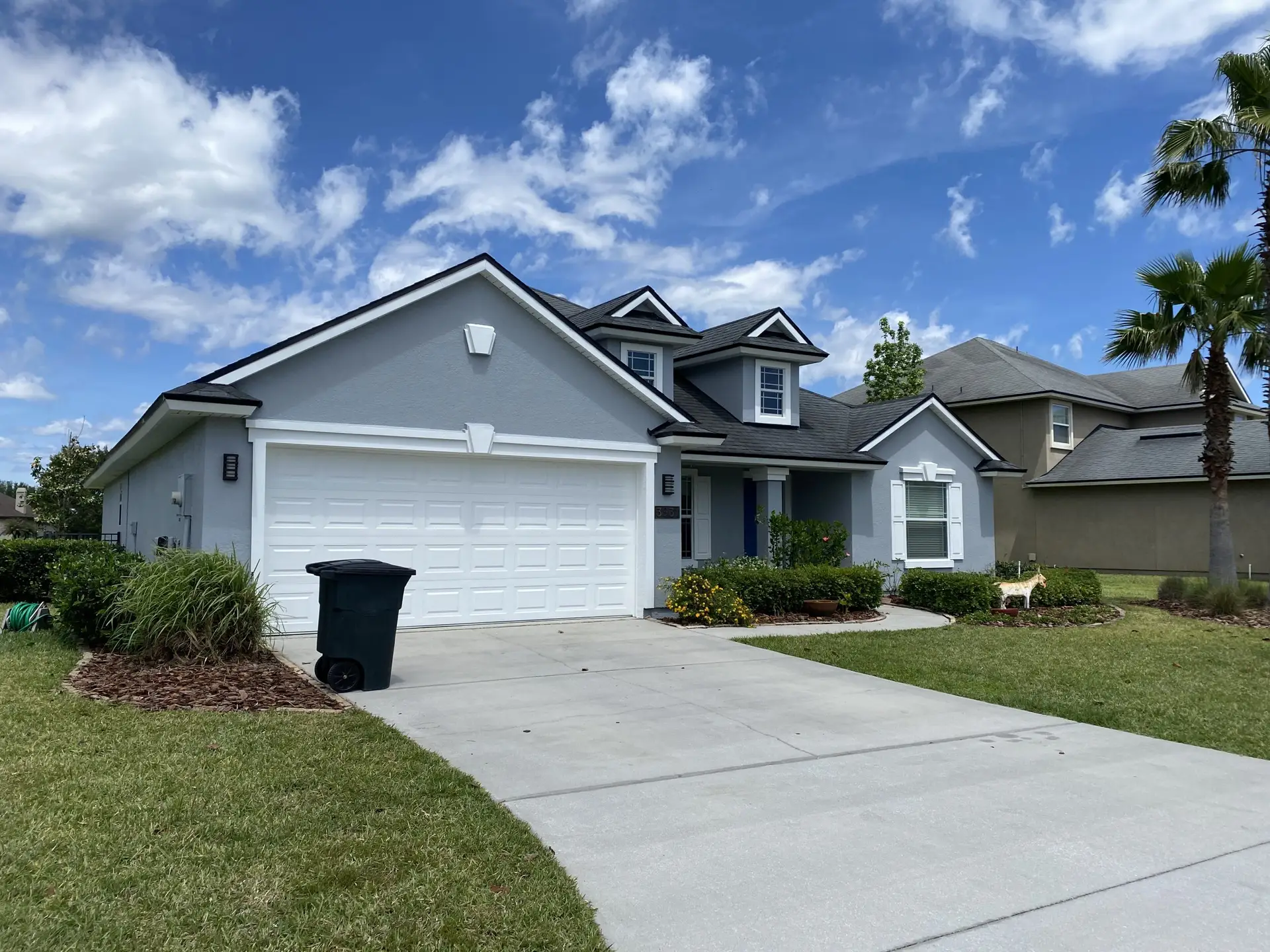 This World Golf Village home received a dramatic color change, turning an outdated, faded green into a modern gray-blue accented with crisp white trim and soffits.